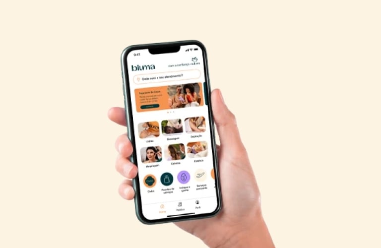 Pelo aplicativo de beleza da Bluma você agenda serviços como manicure, massagem, escova e depilação no conforto da sua casa, com todos os protocolos de segurança e higiene e com a confiança Natura.