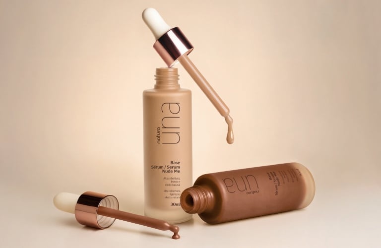 Que tal destacar bem a região central da face? Basta misturar a Base Sérum Nude Me Una do seu tom com um corretivo da mesma marca de um tom mais claro. E para dar um toque de saúde ao rosto, finalize com um blush.
