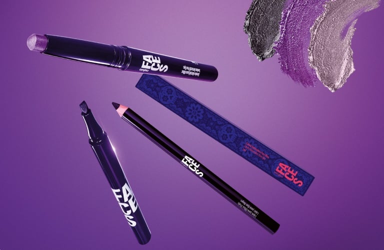 Comece aplicando um primer blur na região das pálpebras para fazer a make durar mais e desfocar as imperfeições com um efeito matte. Com a paleta de sombra para olhos em mãos, use as cores azul e roxo para esfumar bem o côncavo. Depois, puxe um delineado gatinho com um tom mais escuro.