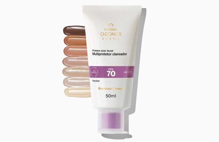 - Protetor Multiclareador FPS 70 Chronos Derma: protege do sol, ajuda a clarear marcas escurecidas e a uniformizar o tom, enquanto evita a formação de novas manchas. Sua textura oferece toque seco, rápida absorção e não deixa a pele oleosa ao longo do dia. Ele contém niacinamida e o bioativo de aroeira, e é testado dermatologicamente. É indicado para todos os tipos de pele, para aplicação no rosto e pescoço.