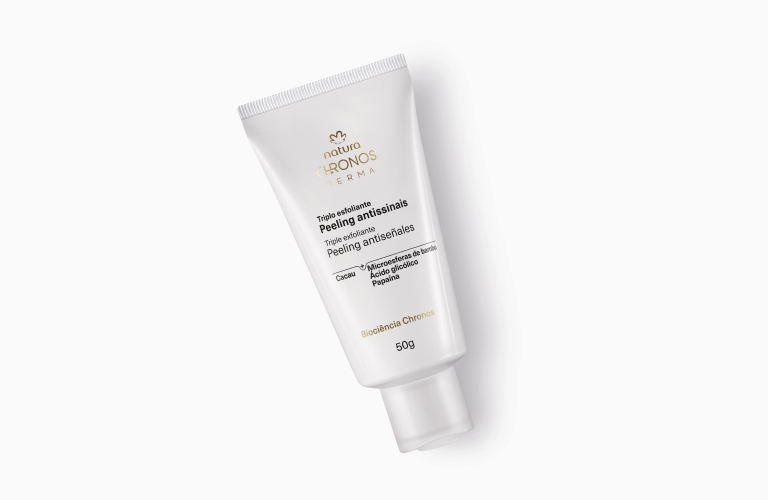 Quer uma dica boa? O Triplo Esfoliante Peeling Antissinais Chronos Derma uniformiza a textura e suaviza a aparência de pele cansada, além de devolver a ela o brilho natural e a vitalidade. Para isso, basta usar de 1 a 2 vezes na semana, em dias alternados, logo após a limpeza da pele.