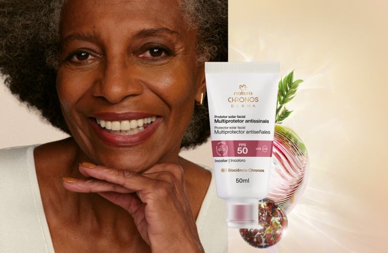 Aqui, você vai encontrar duas dicas especiais! A primeira é o Protetor Multiclareador FPS 70 Chronos Derma, que promove o clareamento das manchas de sol e previne o fotoenvelhecimento. Disponível em duas cores, oferece cobertura natural.