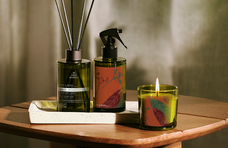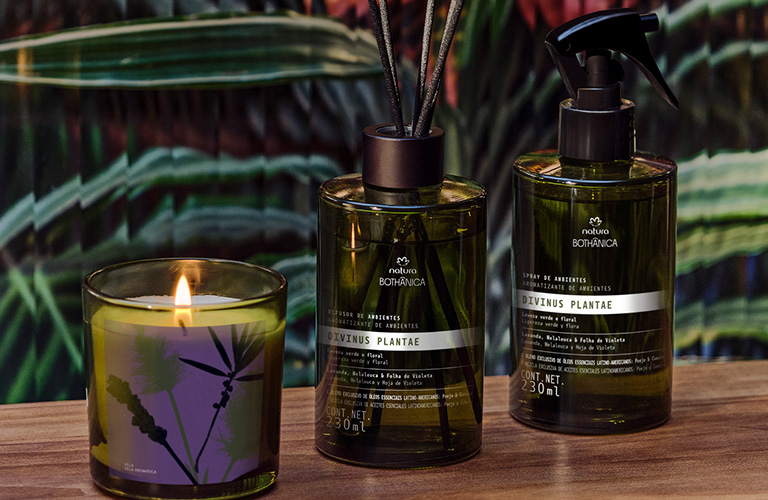A marca conta com difusores e sprays de ambiente, velas aromáticas, sabonetes líquidos, hidratantes para as mãos e óleos essenciais de diferentes fragrâncias. Todas elas desenvolvidas com ingredientes naturais da biodiversidade brasileira, assim como nossos cremes hidratantes e perfumes masculinos e femininos.