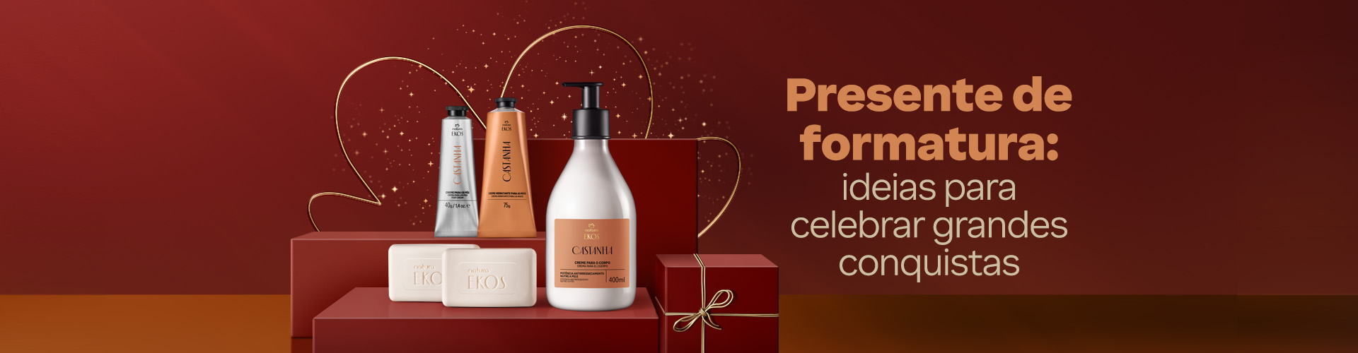 E para aquela pausa necessária para a formanda se cuidar e aliviar o estresse dos novos desafios, o Presente Natura Ekos Tucumã Ritual Hidratante é um gesto de carinho e para que ela tenha um momento só para si. Este ritual completo que nutre e regenera a pele, com óleos essências da Amazônia que cuidam. perfumam e entregam uma sensação de bem-estar.