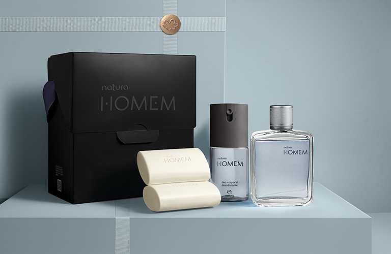 O kit vem com sabonete em barra, desodorante corporal e o desodorante colônia de Natura Homem, todos com a mesma fragrância icônica da linha. Ainda acompanha uma caixa especial de presente.