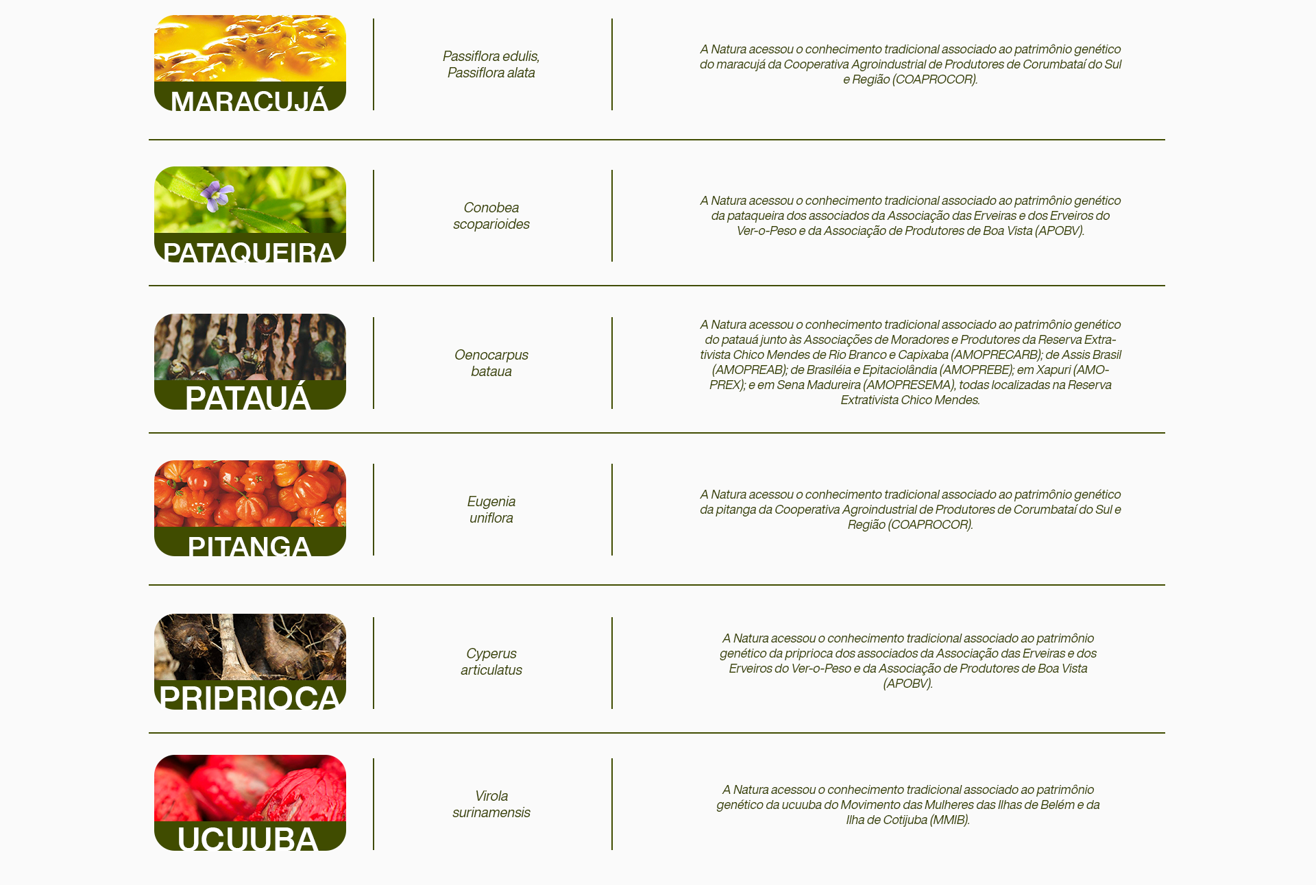 Ao longo dos últimos anos, a Natura desenvolveu alguns ingredientes e produtos a partir do conhecimento tradicional de comunidades parceiras. Reconhecendo a importância desses saberes, a Natura indica a sua origem para cada um dos ingredientes abaixo: