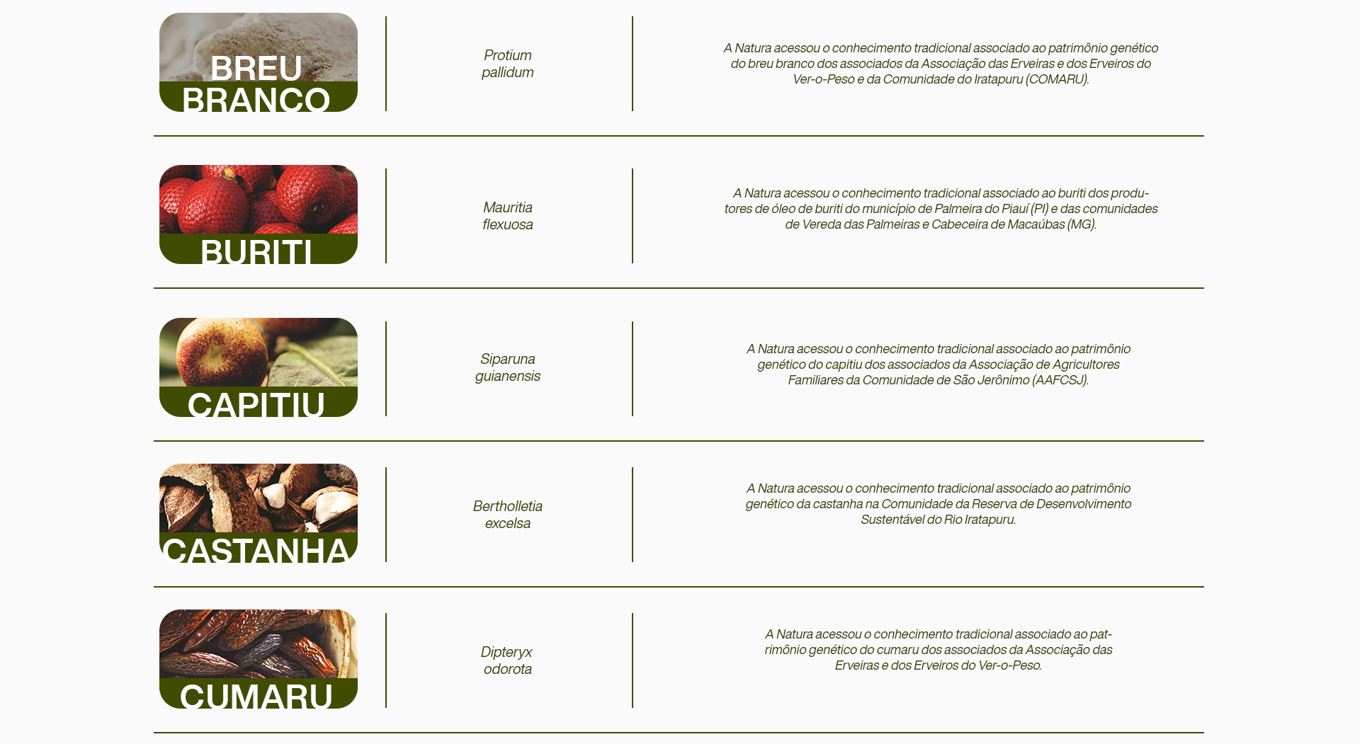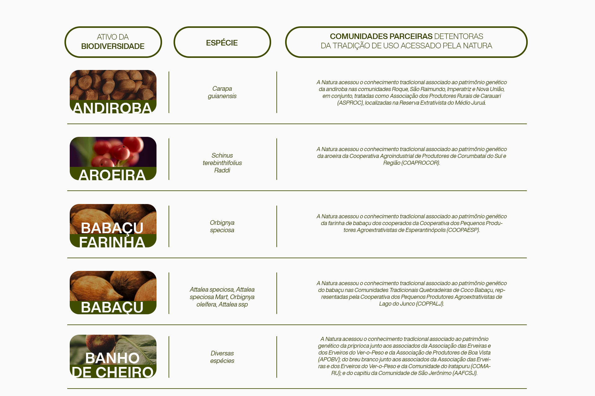 Ao longo dos últimos anos, a Natura desenvolveu alguns ingredientes e produtos a partir do conhecimento tradicional de comunidades parceiras. Reconhecendo a importância desses saberes, a Natura indica a sua origem para cada um dos ingredientes abaixo:
