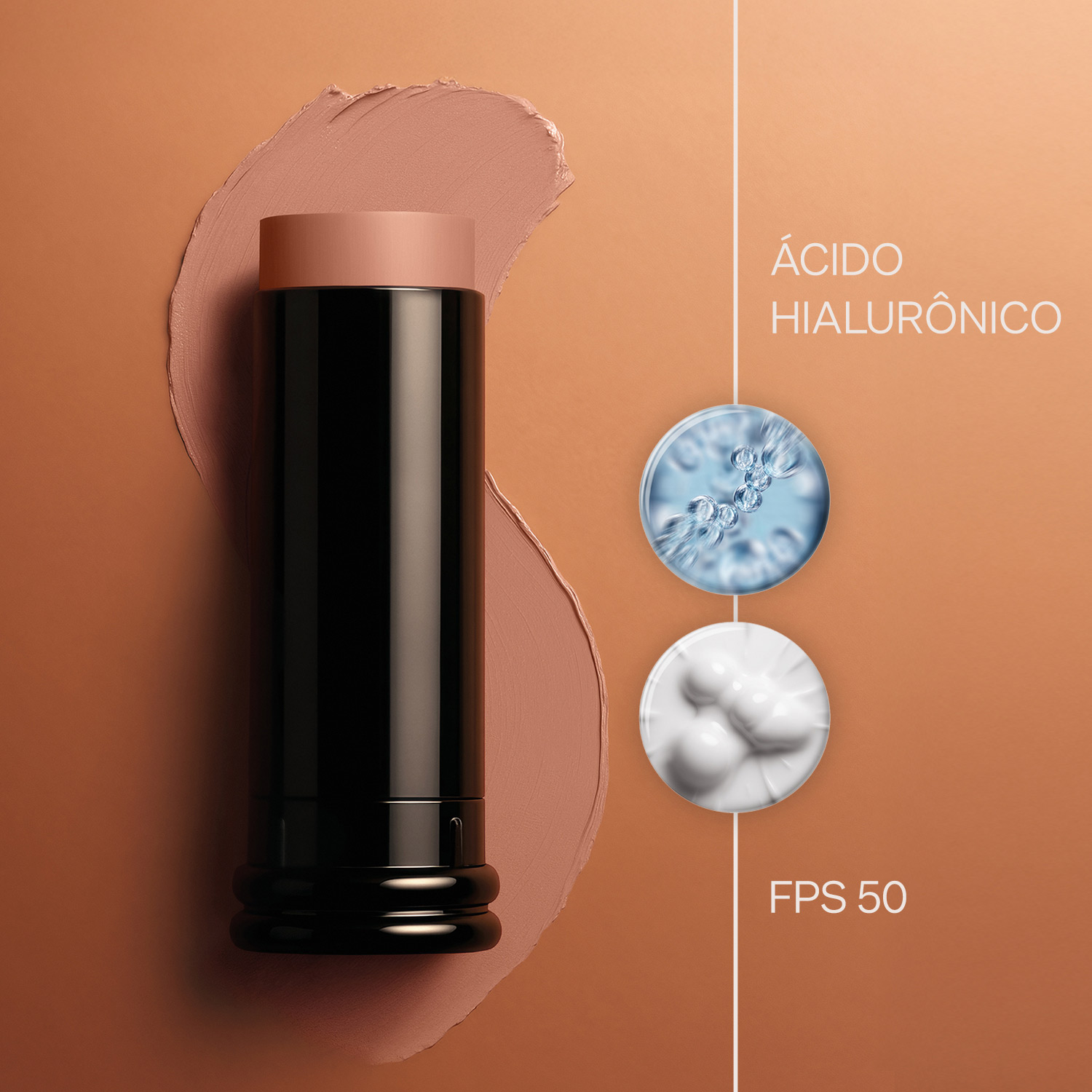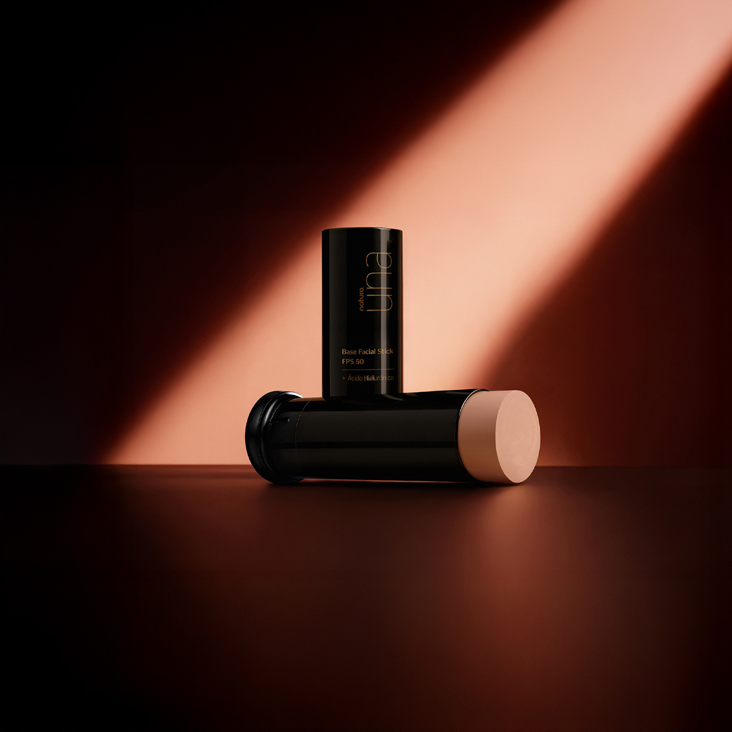 base cremosa em formato stick com FPS 50 e ácido hialurônico.