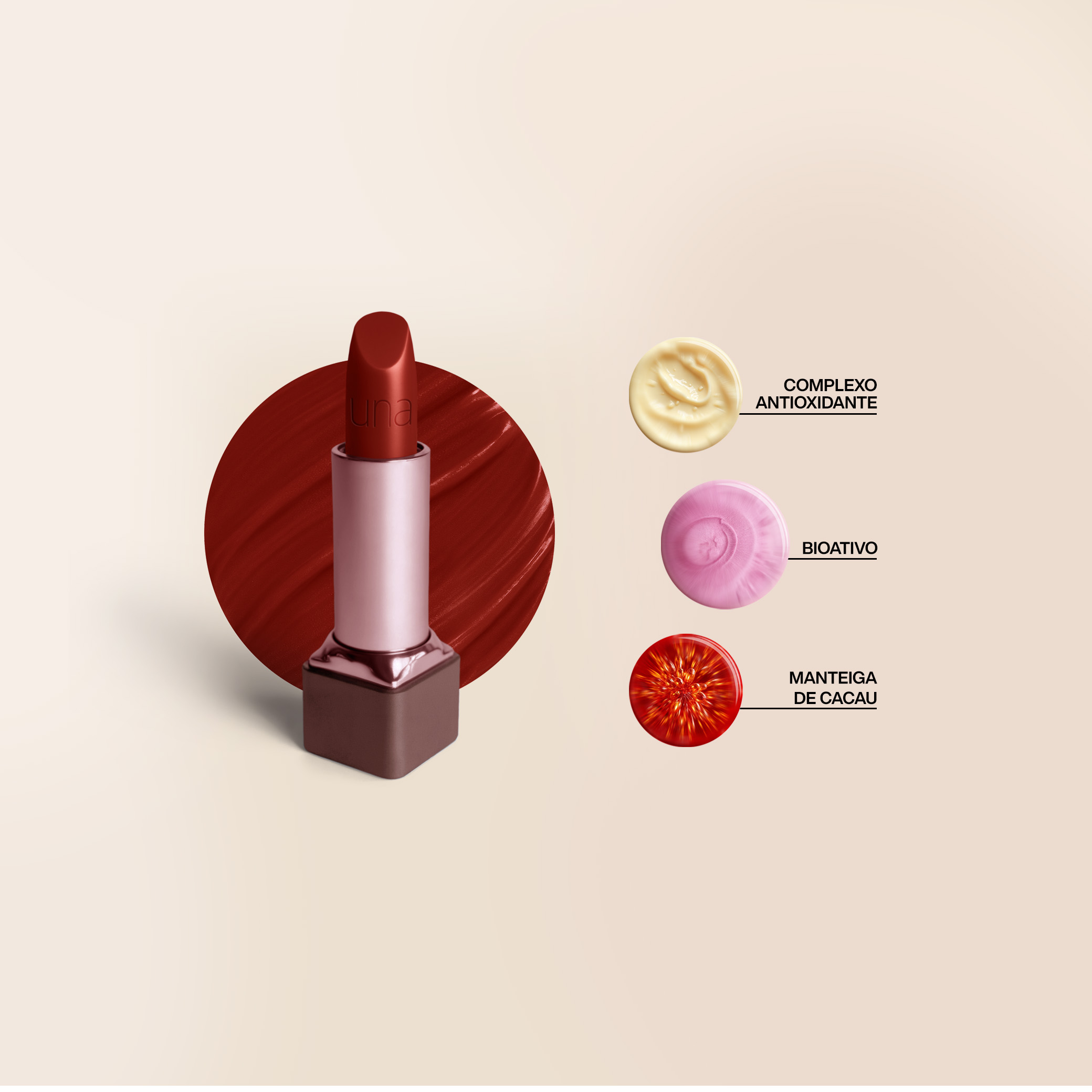 com manteiga de cacau bioativa, o Batom da Natura Una estimula a produção de colágeno, e ceramidas de passiflora, que restauram, recuperam e hidratam os lábios.