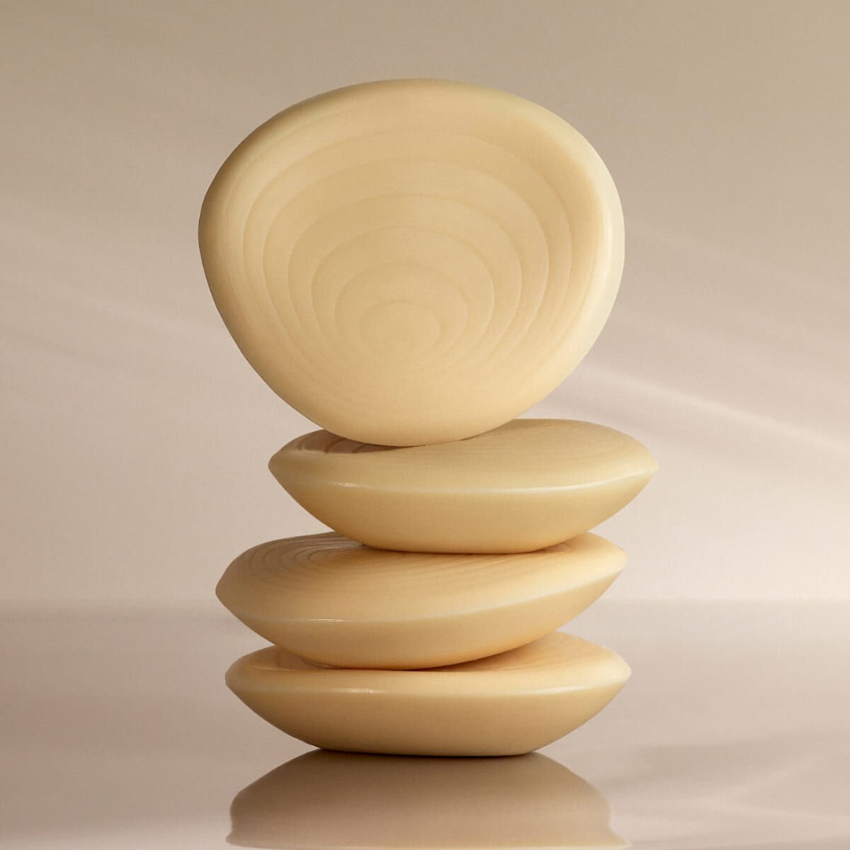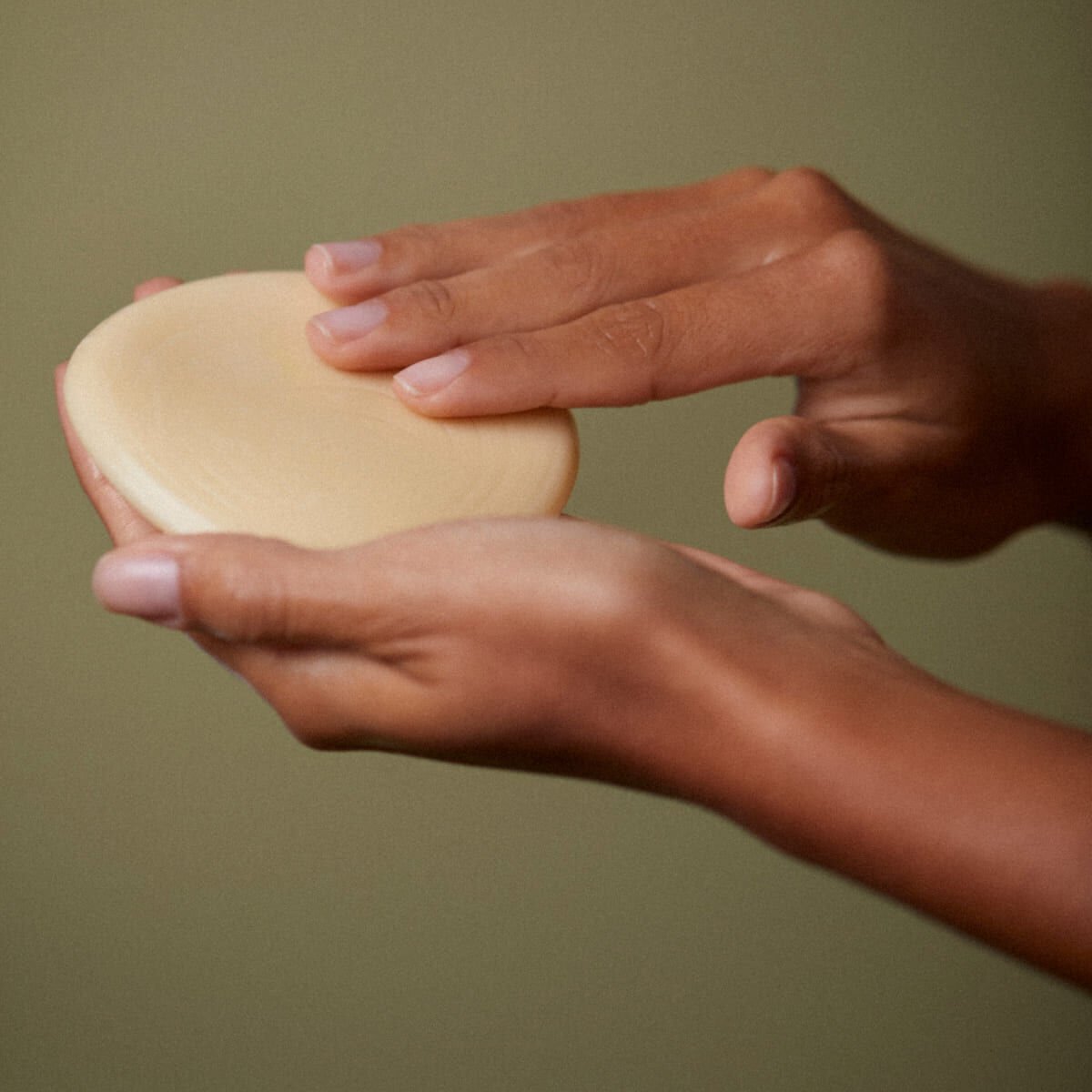 Passo 1: após o uso do shampoo, segure a barra do Condicionador Biōme sob a água e sinta a textura entre as mãos para liberar o condicionador da sua forma sólida.