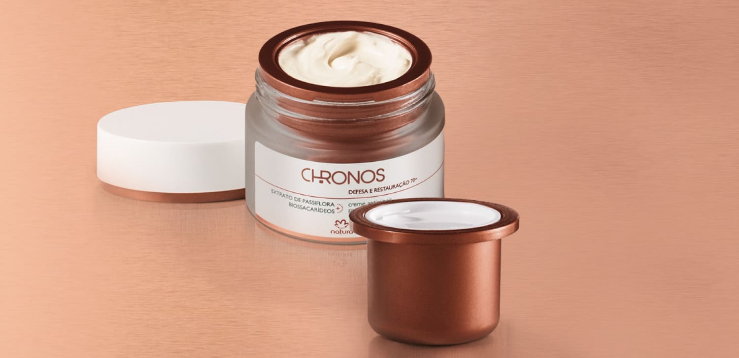 a tecnologia 60+ da Natura combina o extrato de casearia, que intensifica a produção de ácido hialurônico, com oligossacarídeos, que melhoram a comunicação celular. a fórmula contém pataqueira, acessada através do conhecimento tradicional de associações locais, fortalecendo e sustentando a pele.