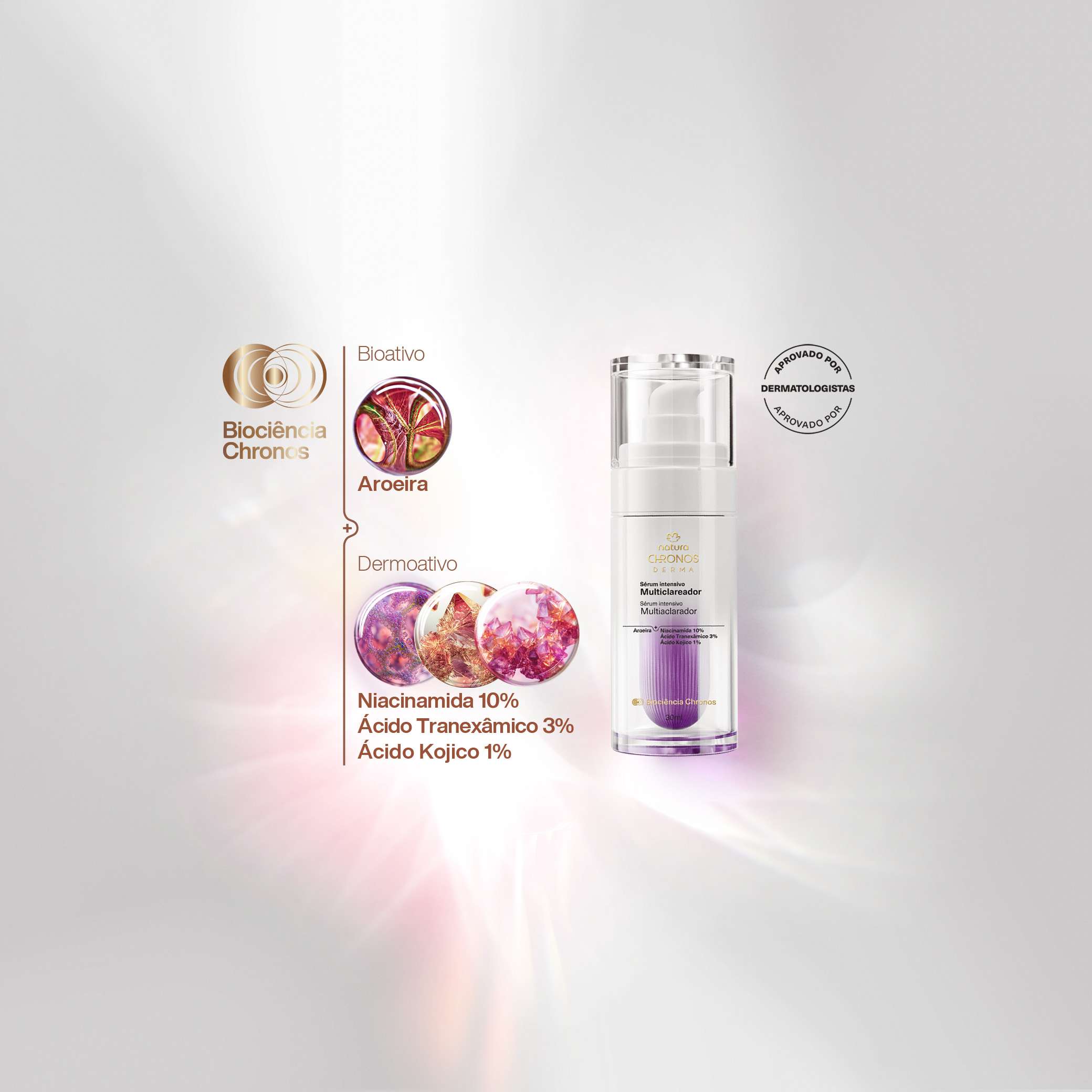 união de potentes bioativos da natureza e dermoativos para cuidar da sua pele. o bioativo Aroeira reduz a produção excessiva da melanina. já os dermoativos Niacinamida 10%, Ácido Tranexâmico 3% e Ácido Kójico1% uniformiza o tom, previnem e reduzem a formação de novas manchas.