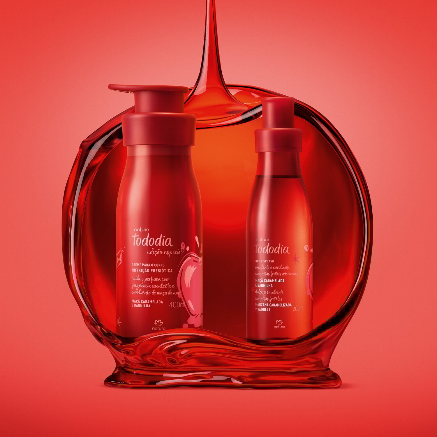 Maçã Caramelada e Baunilha é nossa mais nova edição especial. uma linha inspirada na doçura e suculência da maçã do amor, que celebra a nostalgia das festividades juninas. produtos que vão surpreender com uma hidratação irresistível para deixar você bem festiva Tododia.