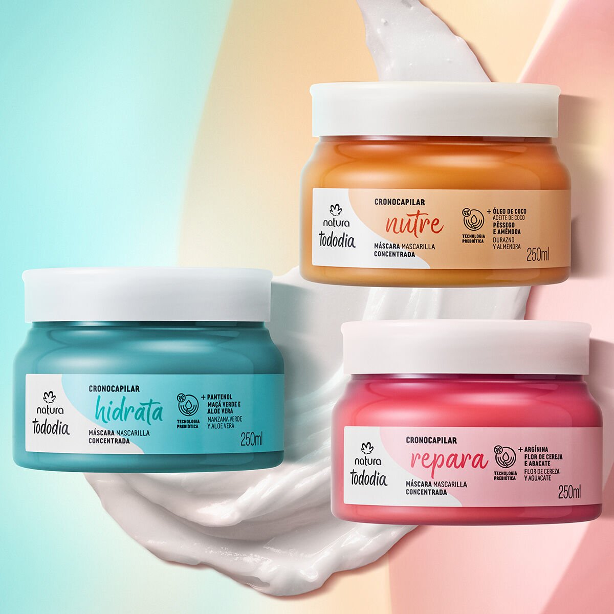 O Cronocapilar de Natura Tododia tem três máscaras concentradas que proporcionam cuidado intenso desde o primeiro uso. Suas fórmulas com Tecnologia Prebiótica cuidam da raiz às pontas para hidratar, nutrir ou reparar os fios. Tododia é dia de cuidar dos seus cabelos com produtos gostosos e fragrâncias deliciosas que trazem bem-estar para sua rotina de um jeito simples e descomplicado.