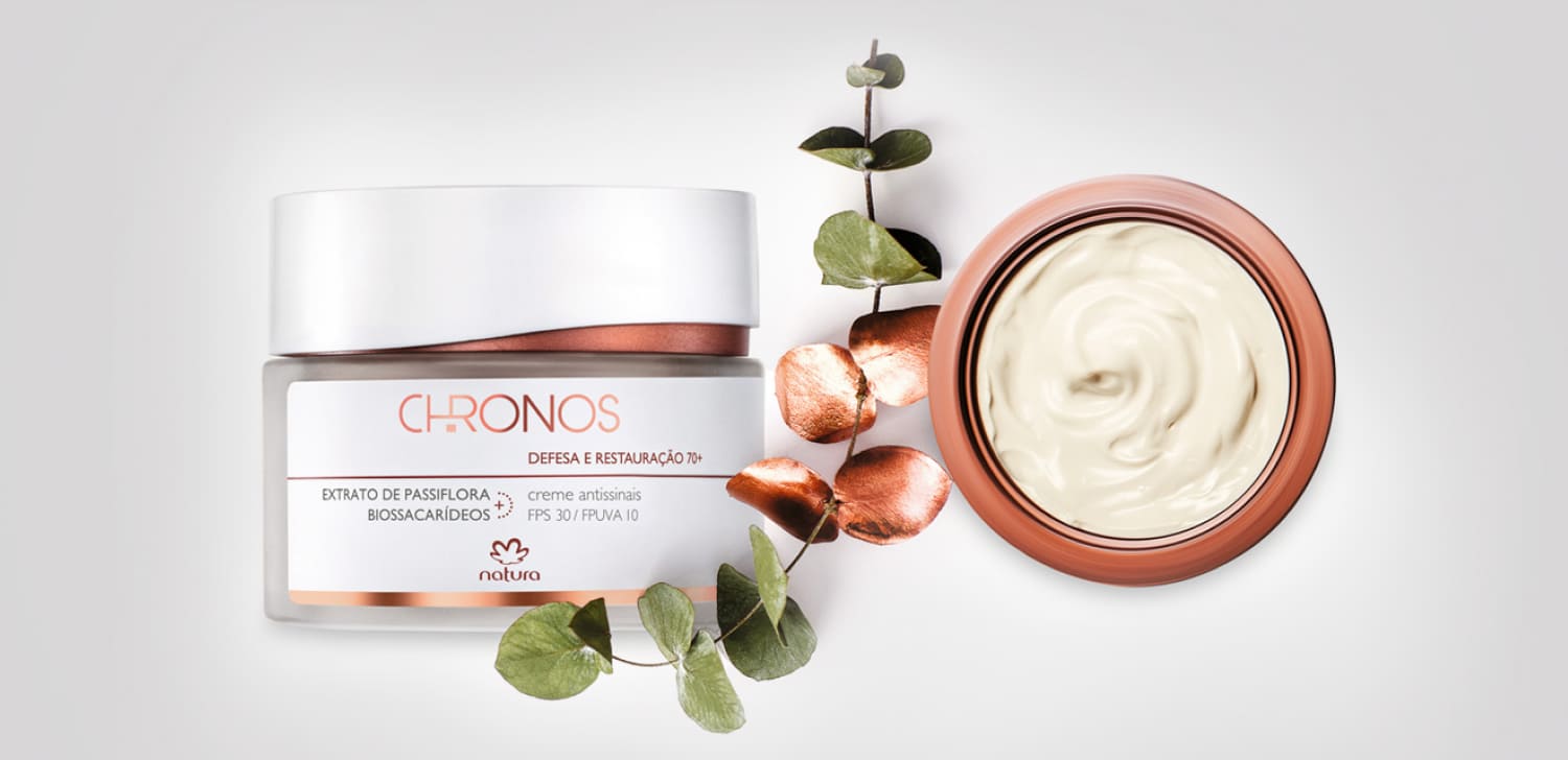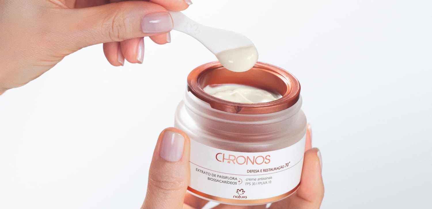 a partir dos 70 anos, a pele fica mais fragilizada e fina. a fórmula avançada do Creme Antissinais Chronos hidrata profundamente, restaura e fortalece o sistema de proteção da pele.