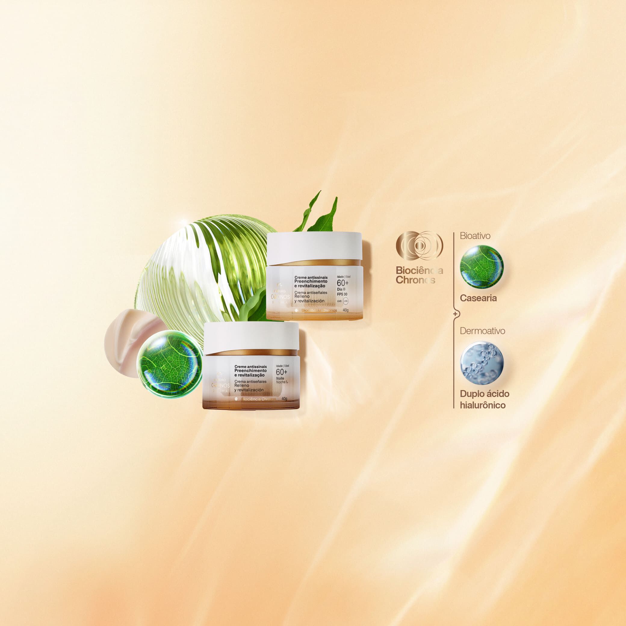 união de potentes bioativos da natureza e dermoativos para cuidar da sua pele. o bioativo Casearia estimula o ácido hialurônico natural da pele. já o dermoativo Duplo Ácido Hialurônico preenche a superfície e as camadas profundas da pele.