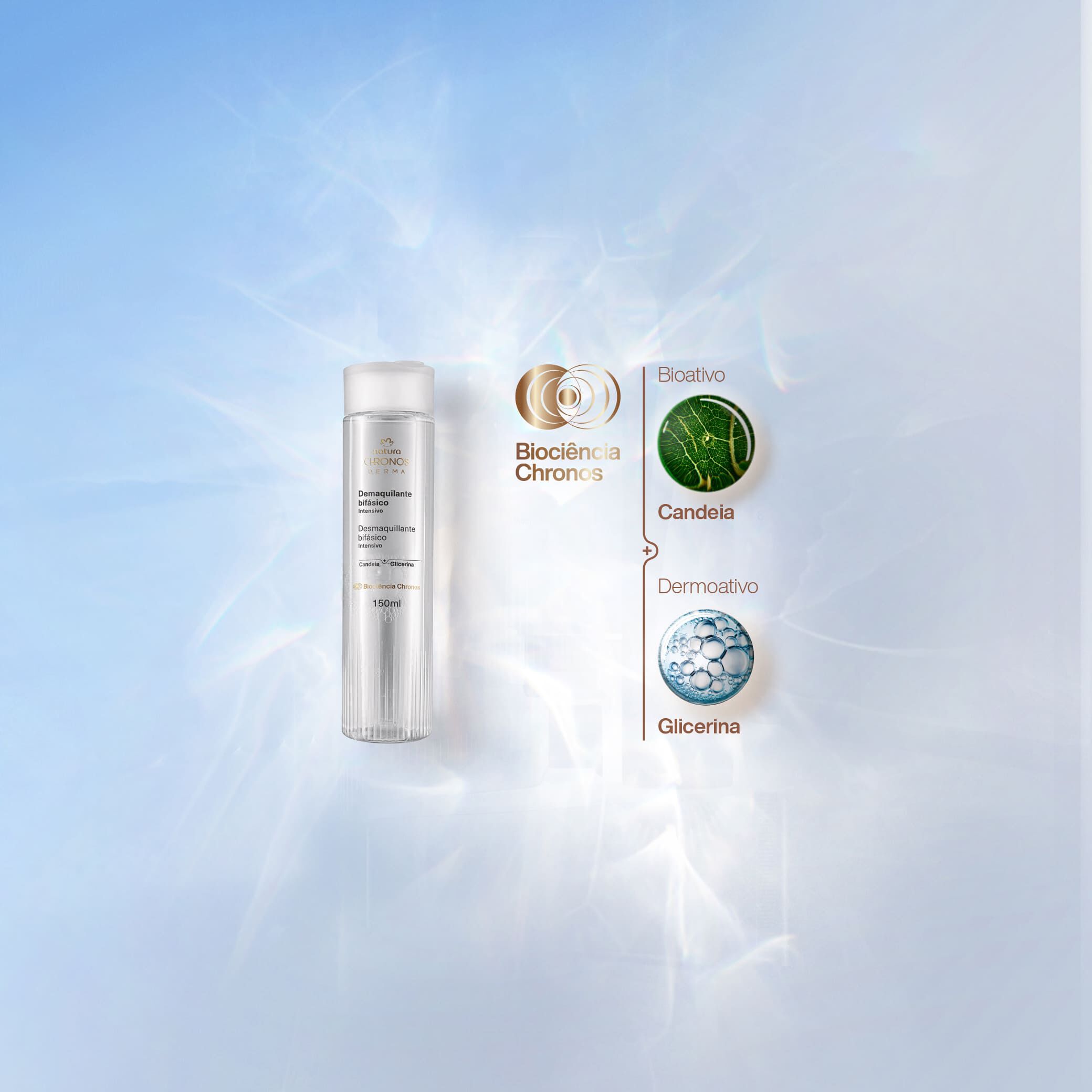 união de potentes bioativos da natureza e dermoativos para cuidar da sua pele. o bioativo Candeia tem ação calmante e de autoproteção da pele. já o dermoativo Glicerina retém a água e mantém a hidratação natural.