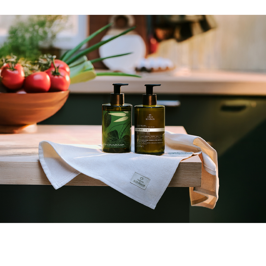 mãos que cozinham merecem o bem estar bem de Natura Bothânica. agora a linha conta com essência para higiene das mãos, sabonete neutralizador de odores, novos hidratantes e panos de copa 100% algodão reciclado. produtos que cuidam e perfumam as mãos com fragrâncias frescas e deliciosas.