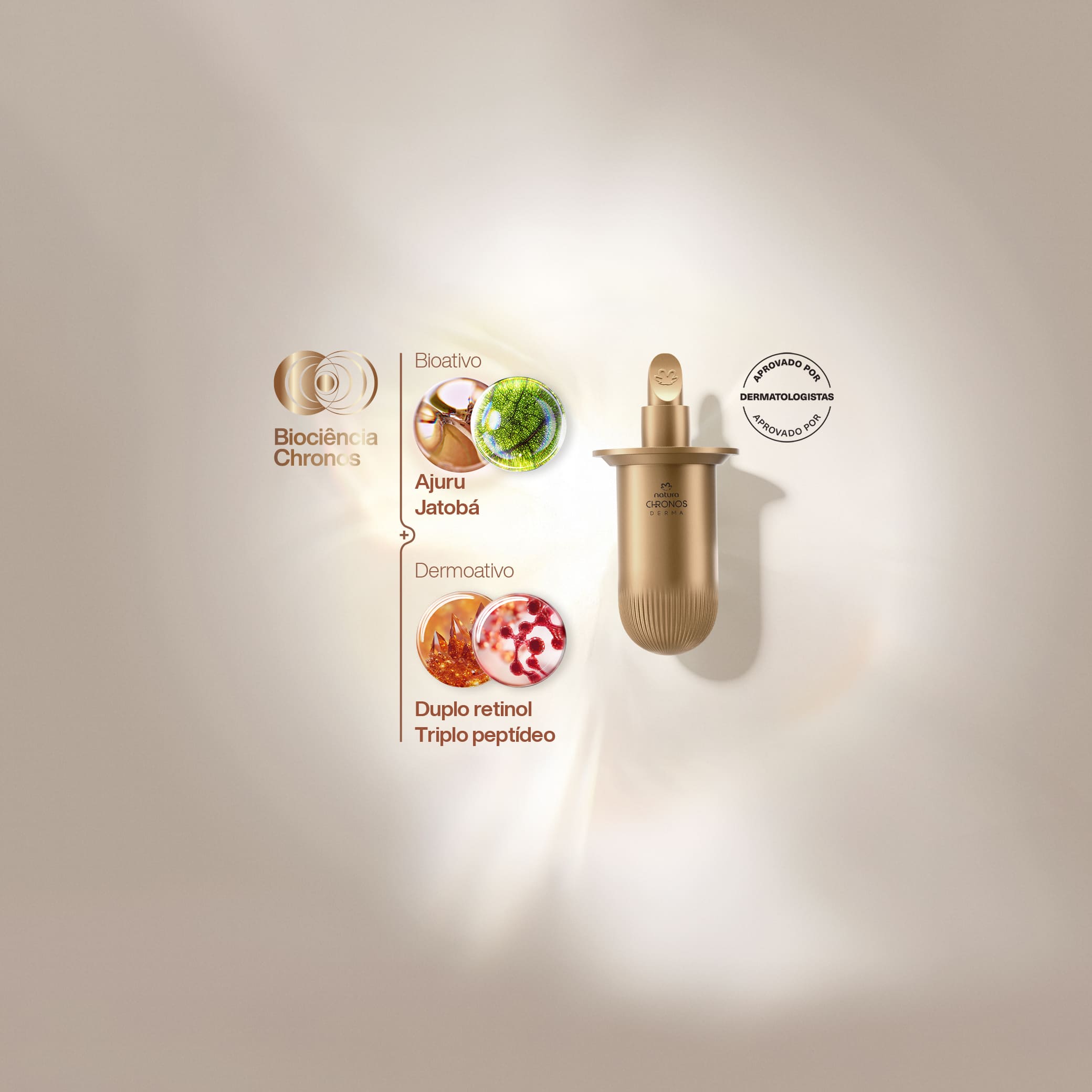 união de potentes bioativos da natureza e dermoativos para cuidar da sua pele. os bioativos Ajuru e Jatobá aumentam a produção, protegem e estimulam o colágeno. já o dermoativo Duplo Retinol potencializa a renovação celular e o Triplo Peptídeo estimula os 3 principais tipos de colágenos da pele.