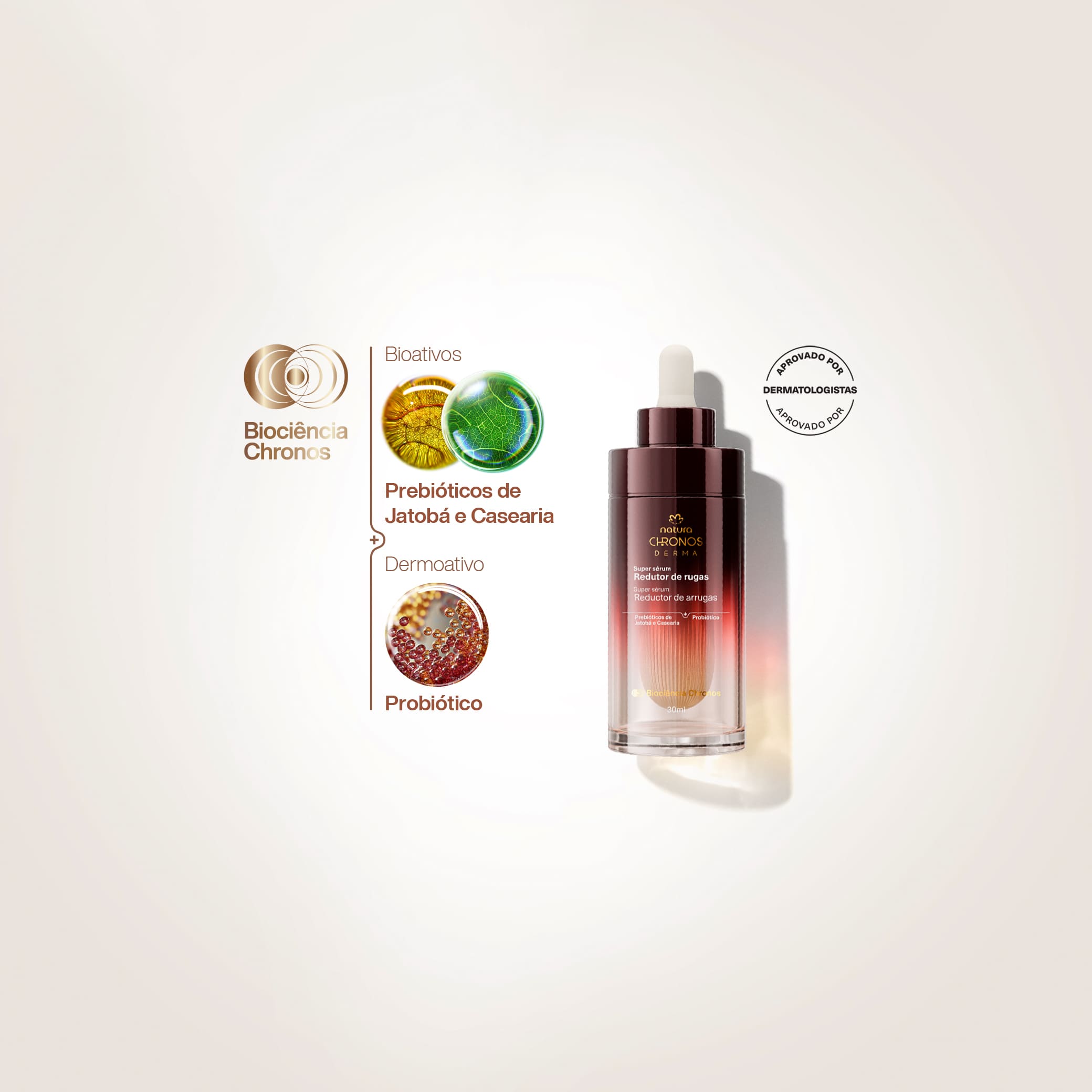 união de potentes bioativos da natureza e dermoativos para cuidar da sua pele. os bioativos Prebióticos de Jatobá e Casearia aumentam a produção de colágeno, elastina e ácido hialurônico. já o dermoativo Probiótico traz 125 milhões de porções probióticas que fortalecem a microbiota da pele.