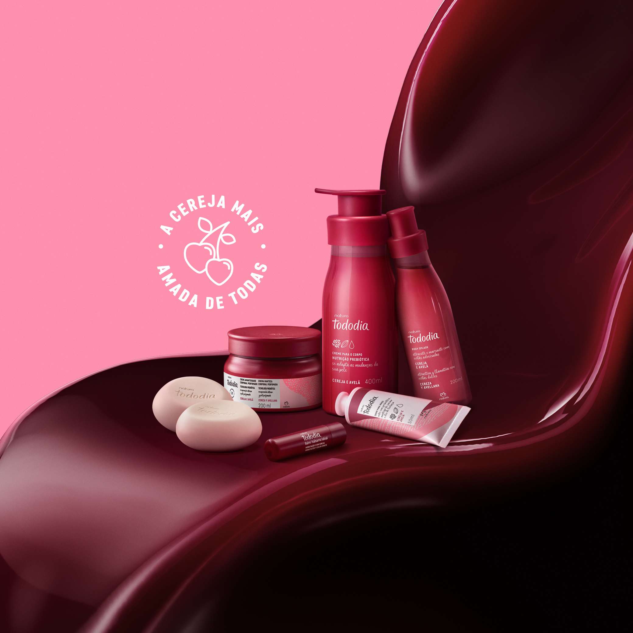 sinta na pele o prazer da hidratação perfumada com o poder da nutrição prebiótica na sua fragrância atraente favorita. uma linha completa de produtos com o adocicado delicioso e inconfundível de Cereja e Avelã. cuidado envolvente desde o banho até a hidratação diária da pele e lábios.
