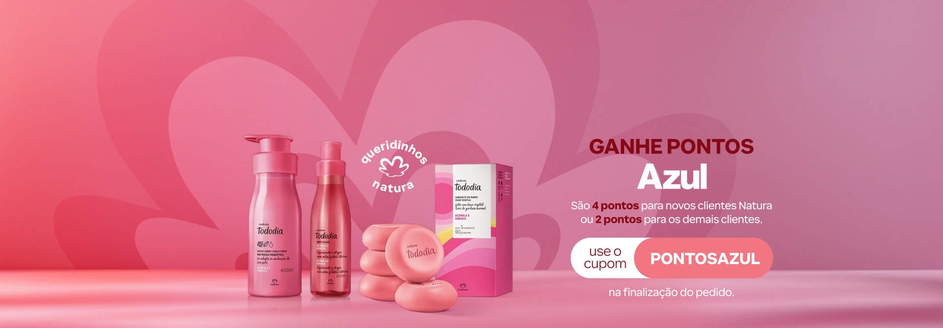 *Promoção válida até 31/05/2026 às 23h59 no horário de Brasília, somente para compras realizadas no Site ou APP Natura + uso do cupom PONTOSAZUL na finalização do pedido. Ganhe 4 pontos por real gastos se for a sua primeira compra no site ou APP Natura e 2 pontos por real gasto caso já seja cliente no site ou APP Natura. Os pontos serão creditados em até 30 dias úteis após a confirmação do pagamento e não serão depositados caso o produto seja devolvido ou em caso de cancelamento. A Oferta é válida para membros da AZUL FIDELIDADE que utilizarem na compra o mesmo CPF. O valor do frete não está incluso no crédito da pontuação. Promoção válida apenas para cliente final, não podendo participar consultoras de beleza Natura, nem na modalidade Natura Entrega.